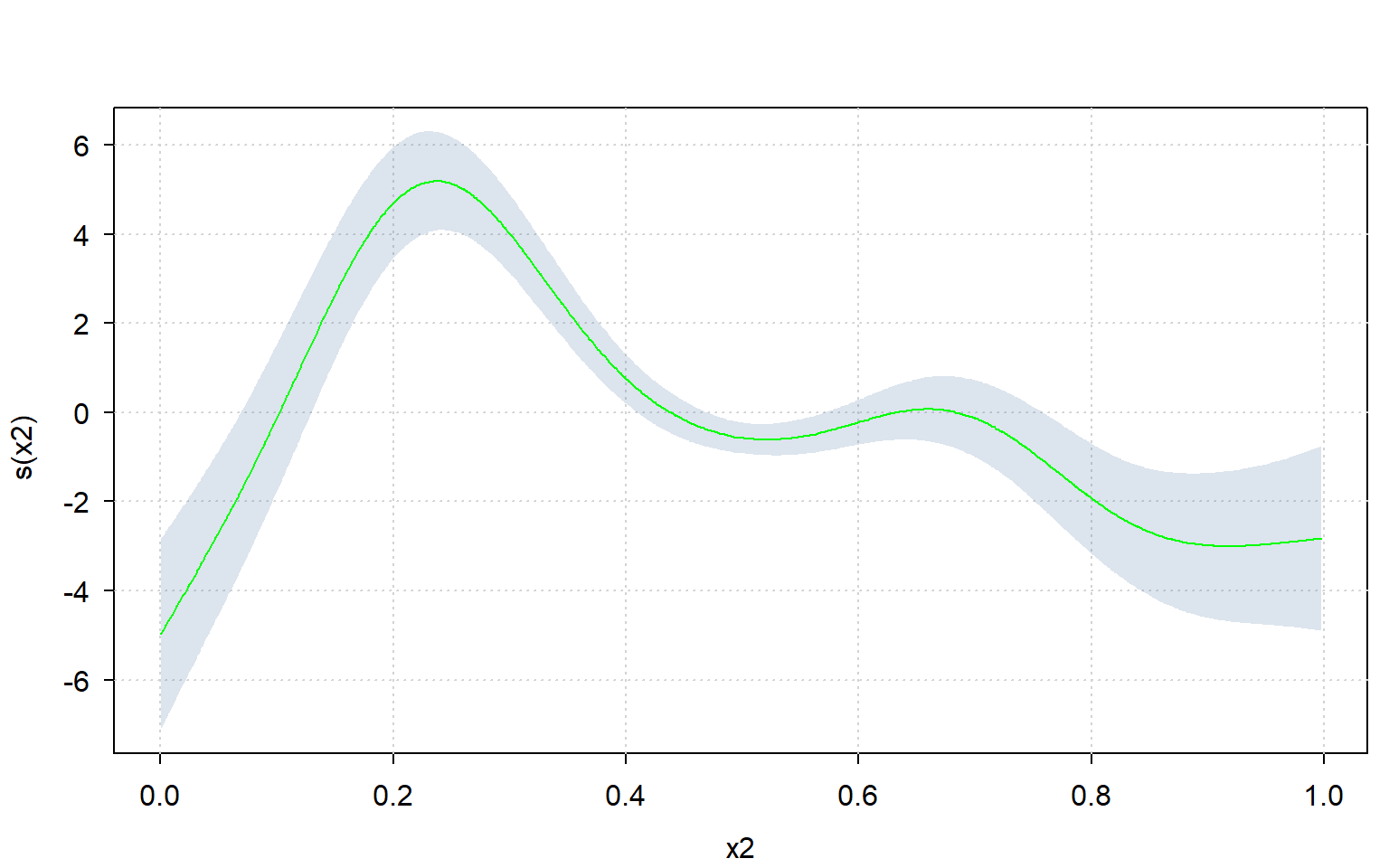 First, let’s create some data, fit a GAM on it, and plot the spline for variable “x2”: