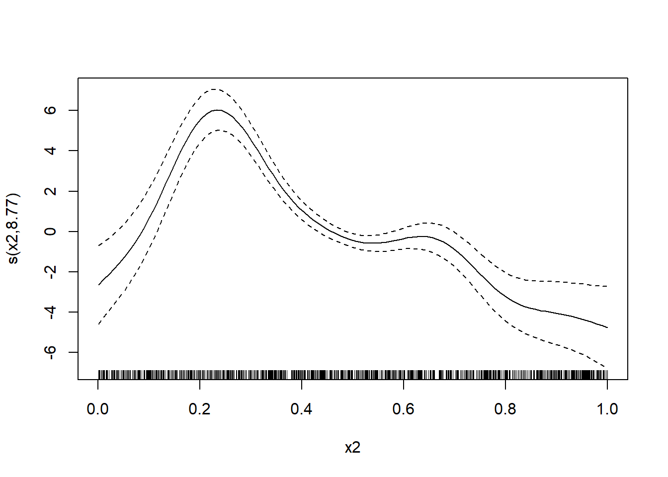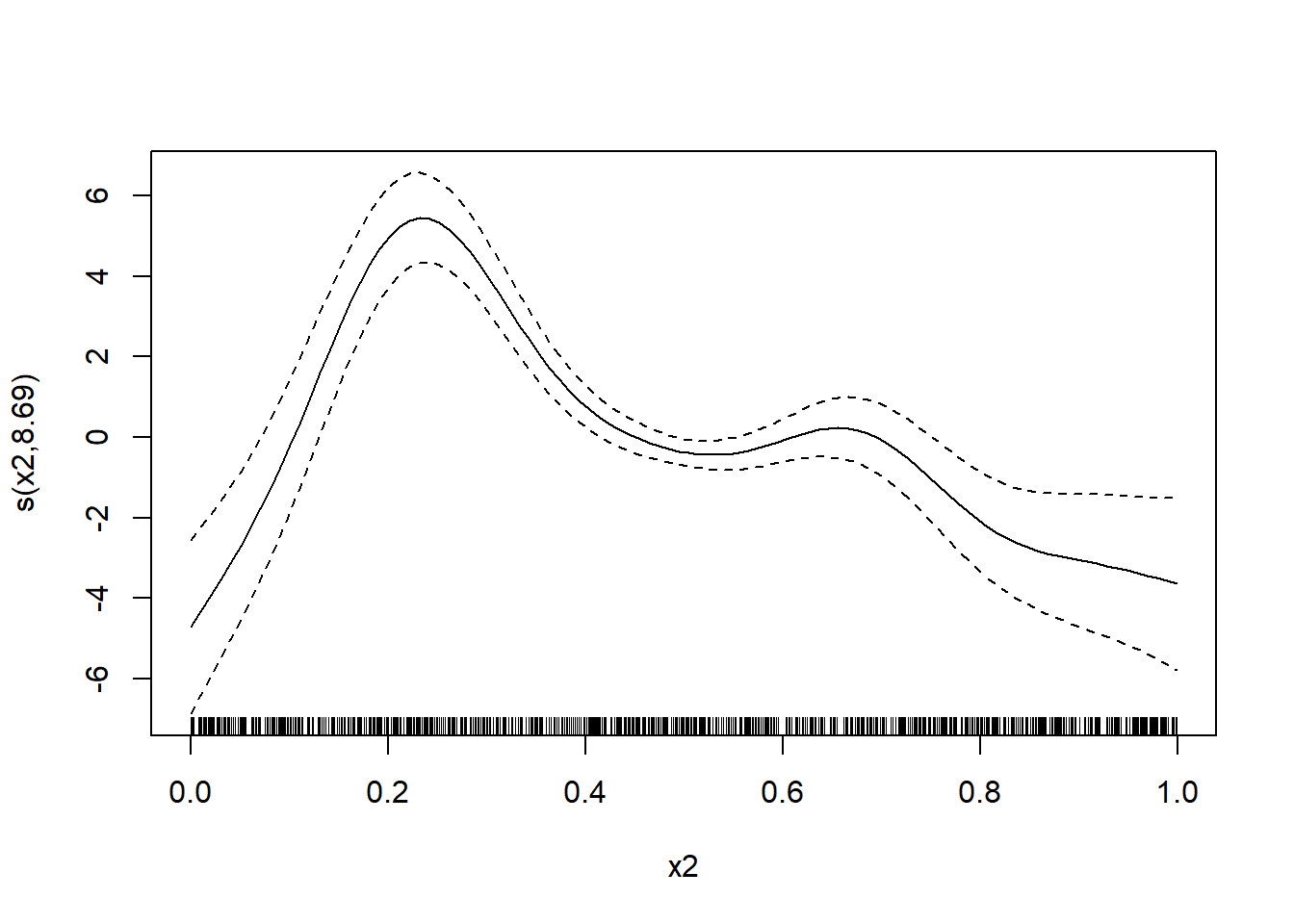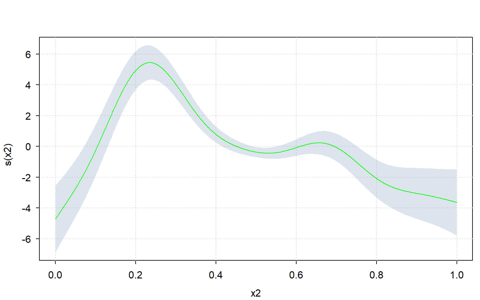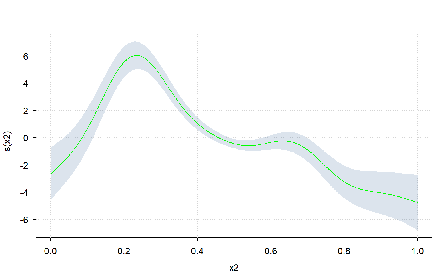 First, let’s create some data, fit a GAM on it, and plot the spline for variable “x2”: